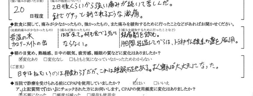 Q.術後、強い痛みは何日程度続きましたか?また、痛みの度合いについて具体的なご意見をお聞かせください。
