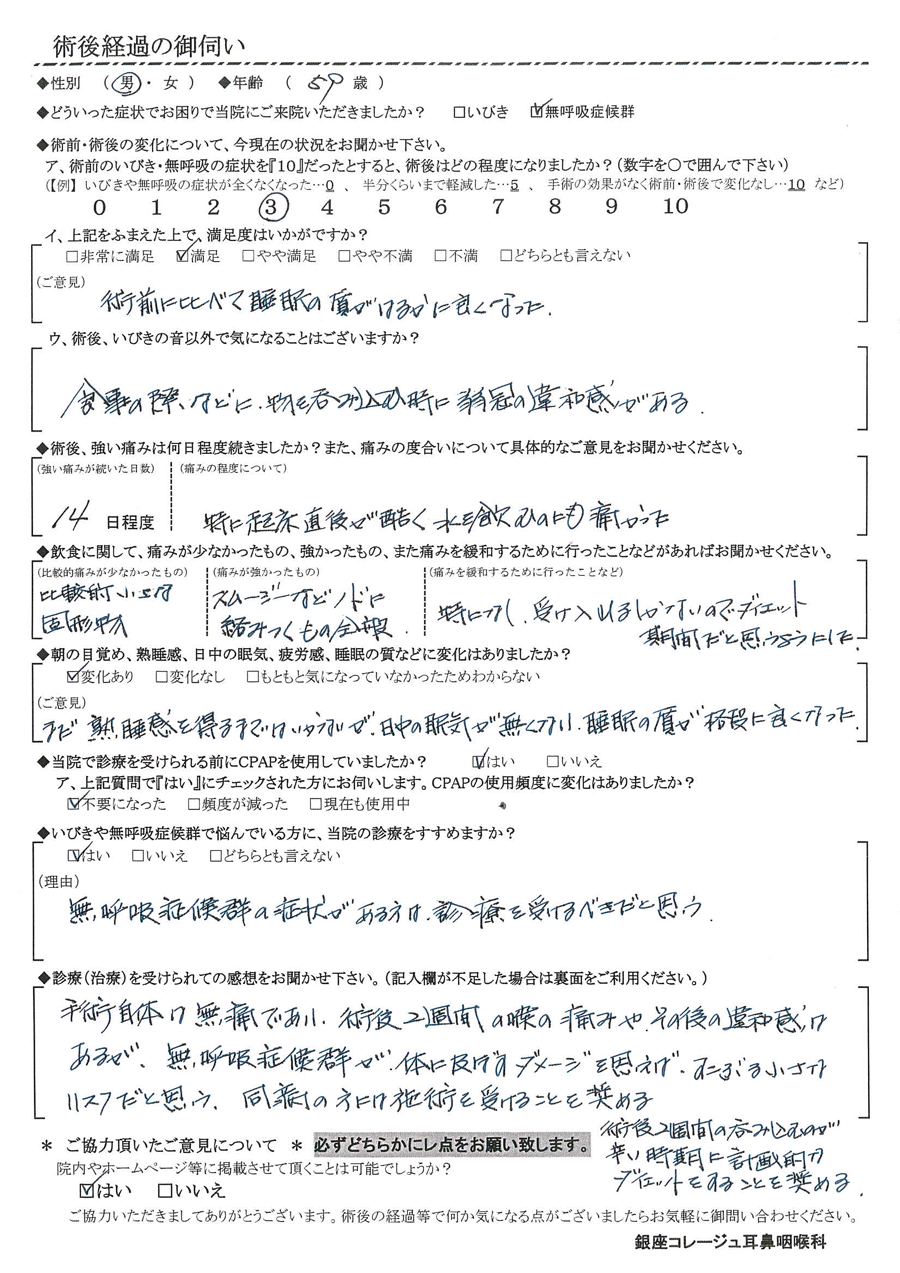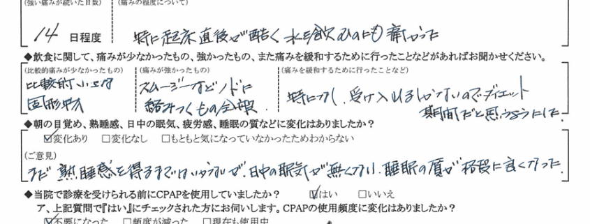 (ご意見) 術前に比べて睡眠の質がはるかに良くなった。