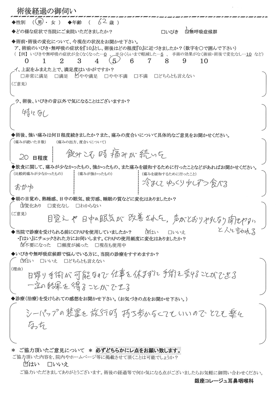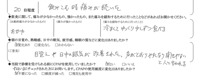(ご意見) 目覚めや日中に眠気が改善された。声が通りやすくなり、聞きやすいと人に言われる。