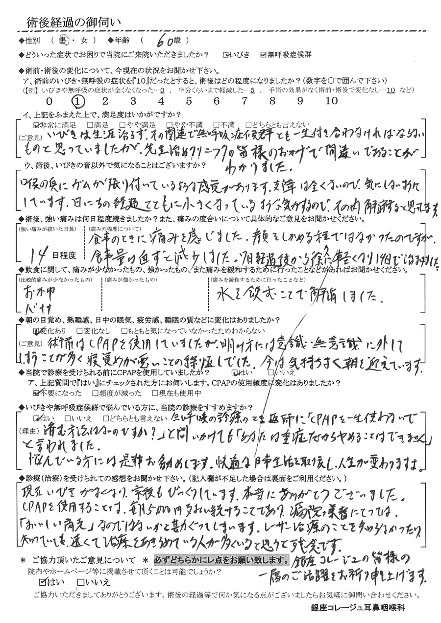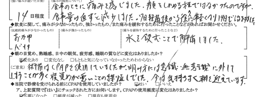 (ご意見) 術前はCPAPを使用していましたが、明け方には意識・無意識に外してしまう事が多く、寝覚めが悪い事の繰り返しでした。今は気持ちよく朝を迎えています。