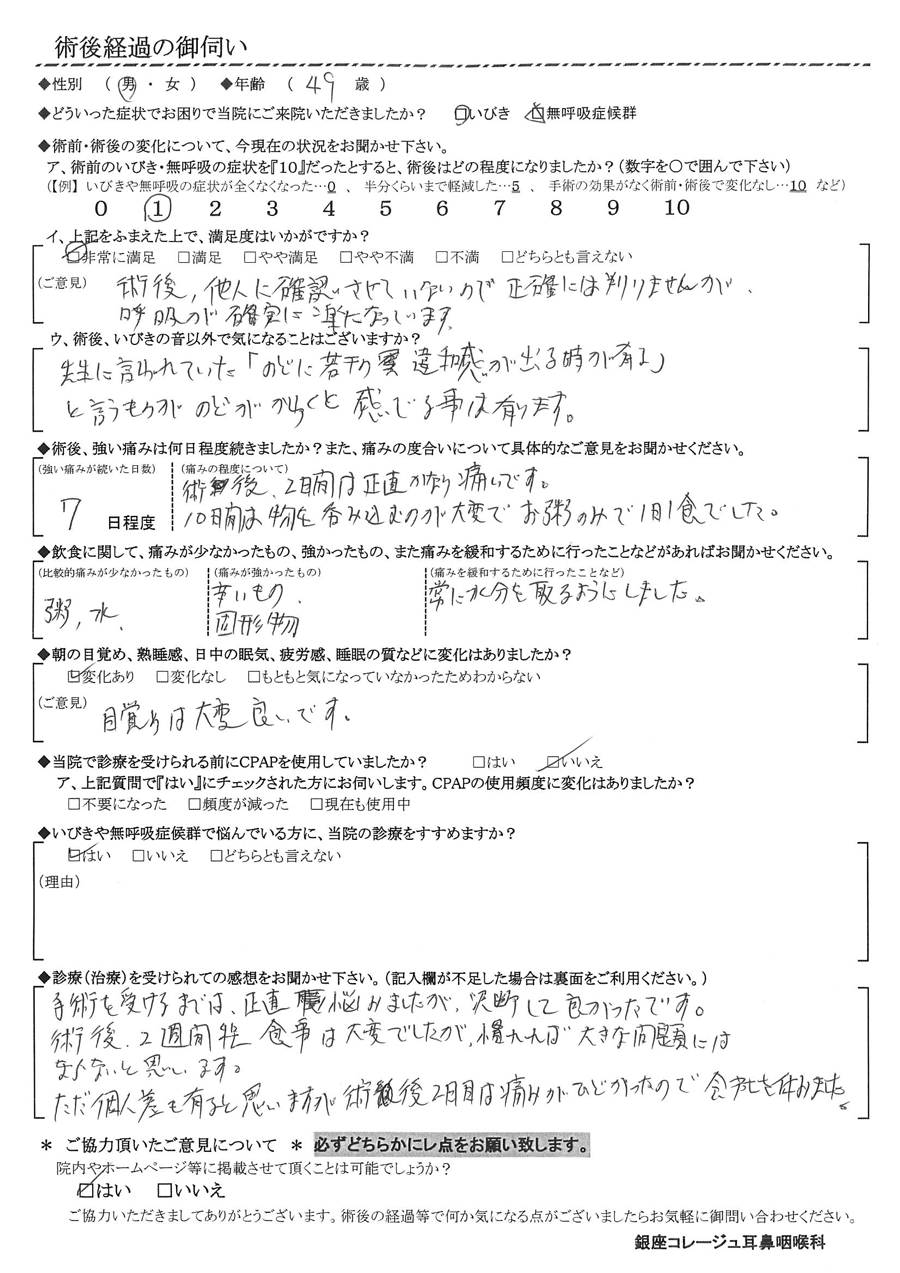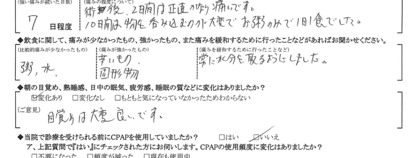 (ご意見) 術後、他人に確認させていないので正確には判りませんが、呼吸が確実に楽になっています。