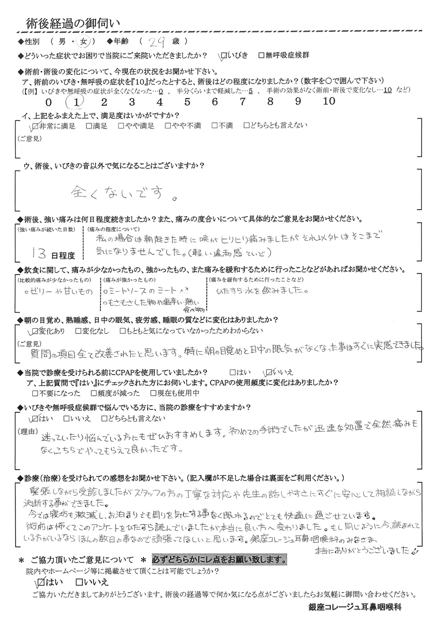 術後は怖くてこのアンケートをひたすら読んでいましたが、本当に良い方へ変わりました。もし同じように今読まれている方がいるなら、ほんの数日の事なので頑張ってほしいと思います。銀座コレージュ耳鼻咽喉科の皆様本当にありがとうございました!!