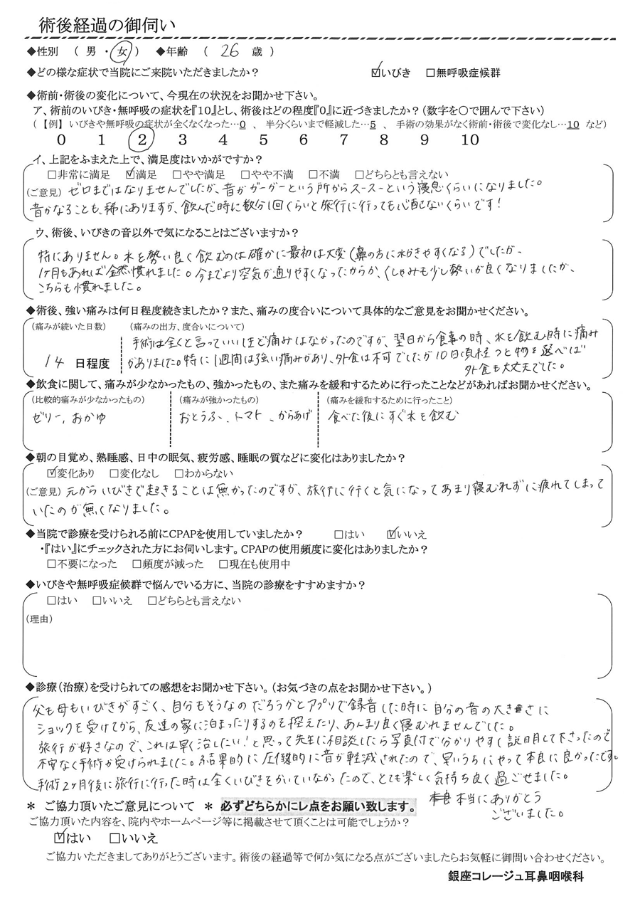 旅行が好きなので、これは早く治したい!と思って先生に相談したら、写真付きで分かりやすく説明して下さったので不安なく手術が受けられました。結果的に圧倒的に音が軽減されたので、早いうちにやって本当に良かったです。手術2ヶ月後に旅行に行った時は全くいびきをかいていなかったので、とても楽しく気持ち良く過ごせました。本当にありがとうございました。