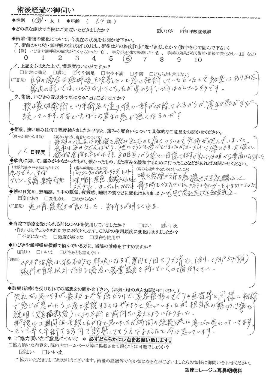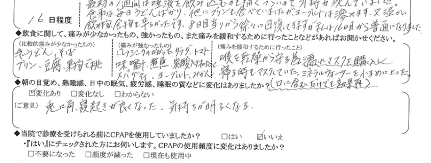 (ご意見) 自分の場合は無呼吸を改善したいと思い施術していただいたので、効果はありました。