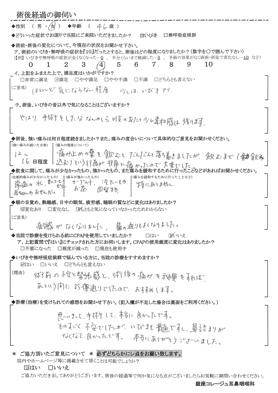 A:思い切って手術して本当に良かったです。ものすごく不安でしたが、いびきも普通ですし鼻詰りがなくなって良かったです。本当にありがとうございました。