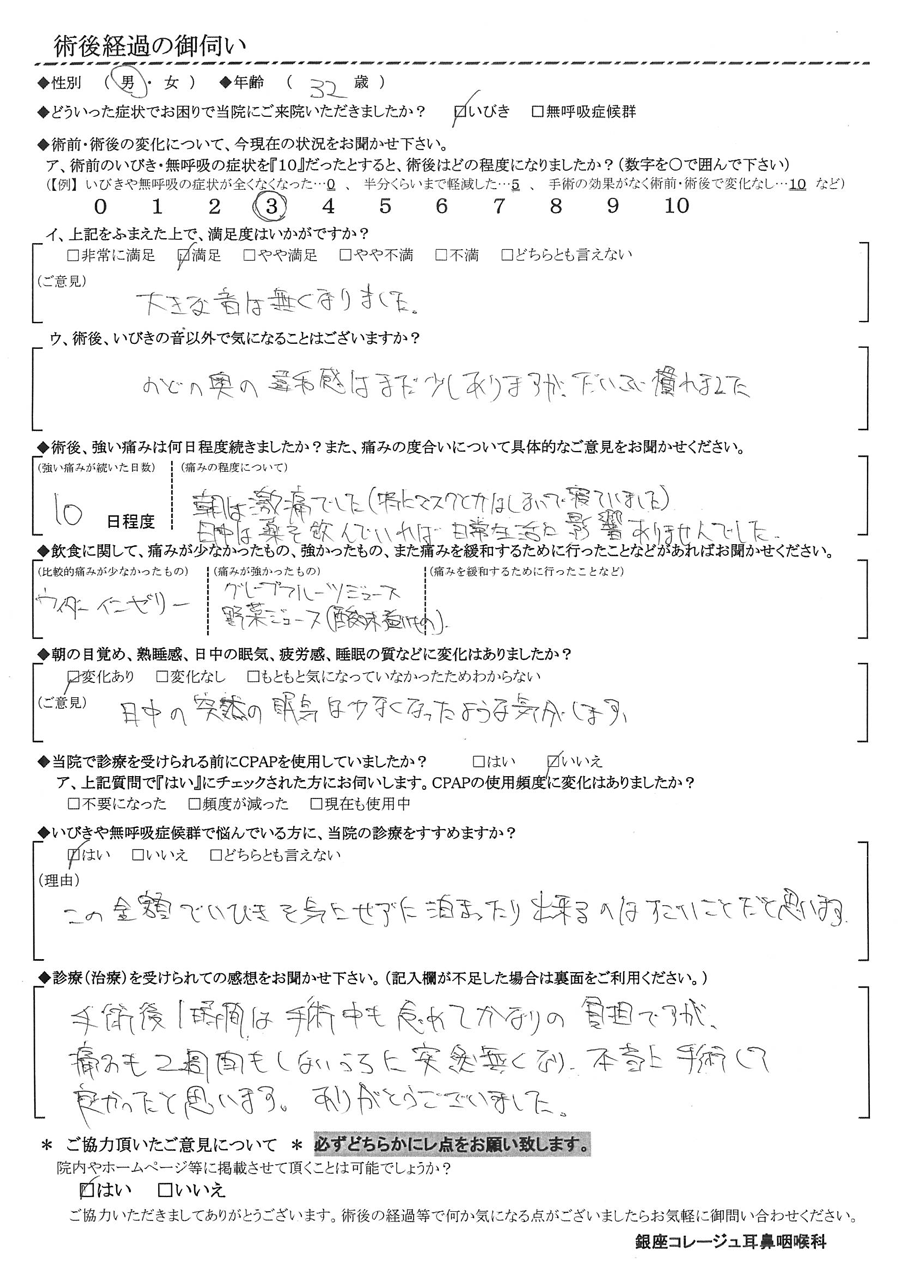 ア, 術前のいびき・無呼吸の症状を『10』だったとすると、術後はどの程度になりましたか? 【3】
