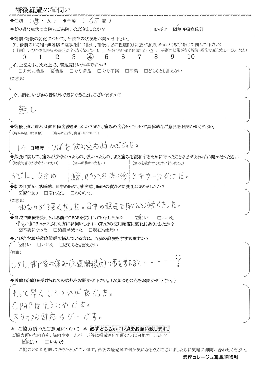 A:もっと早くしていれば良かった。CPAPはもう嫌です。スタッフの対応はグーです。