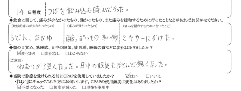 (ご意見) 眠りが深くなった。日中の眠気はほとんど無くなった。