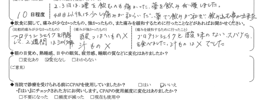 (痛みの程度について) 2・3日は唾を飲むもの痛かった。薬を飲み我慢しました。4日目以降は少し痛みが和らいだ。薬で痛みが和らぎ飲み込む事が出来ました。