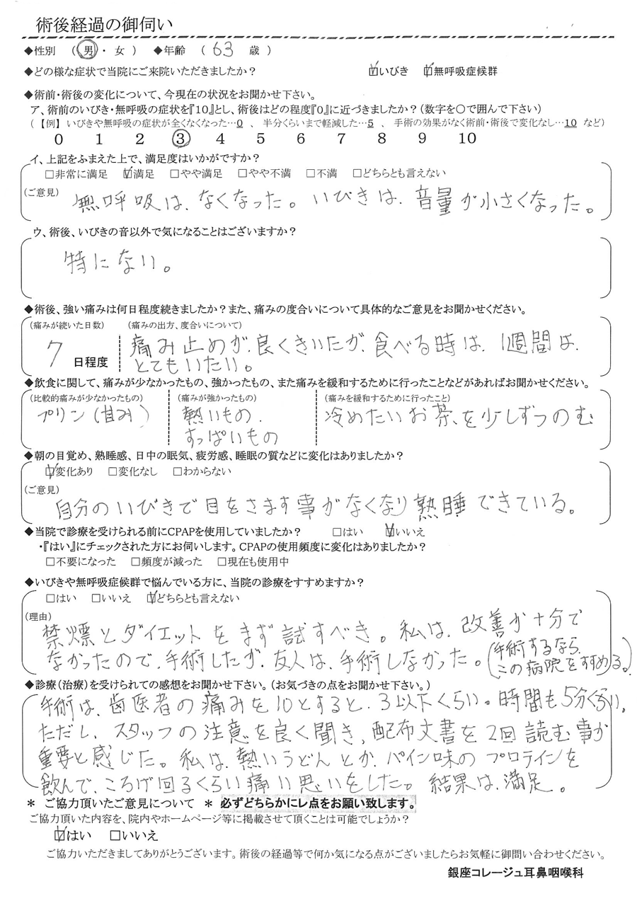 (ご意見) 自分のイビキで目を覚ます事がなくなり熟睡出来ている。