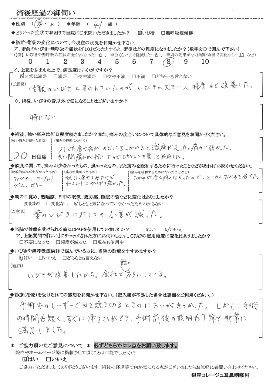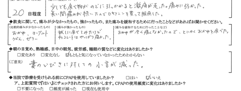 (ご意見) 怪獣のいびきと言われていたのが、いびきの大きい人程度まで改善した。