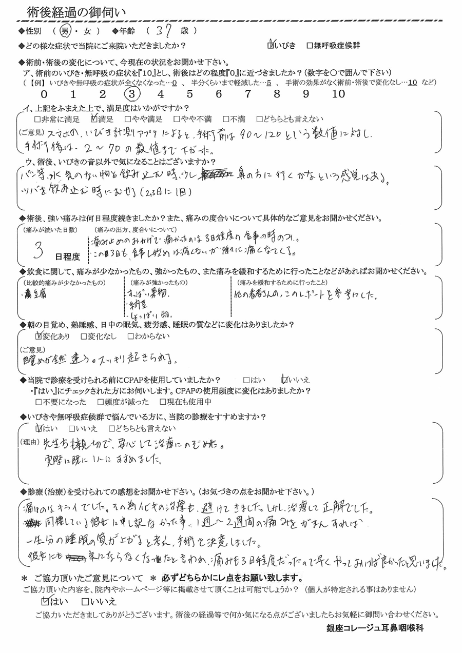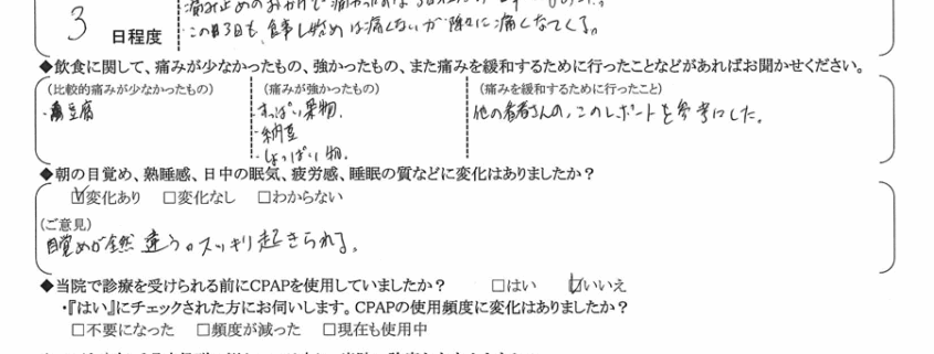 (ご意見) スマホのいびき計測アプリによると、手術前は90~120という数値に対し、手術後は、2~70の数値まで下がった。