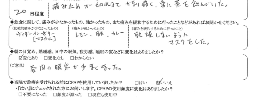 A:(痛みを緩和するために行ったこと) 乾燥しないようにマスクをした。