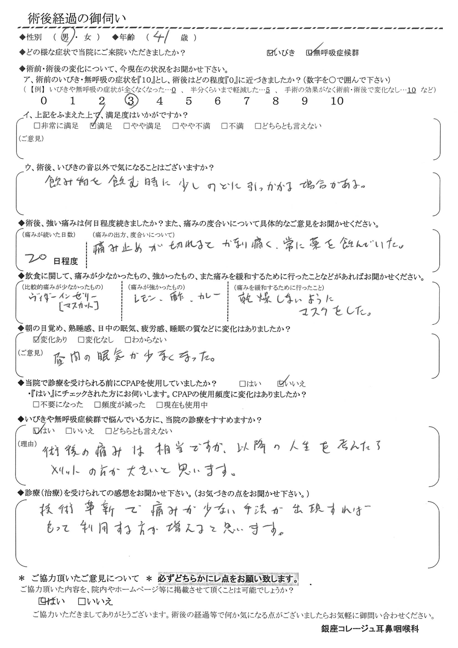 ア, 術前のいびき・無呼吸の症状を『10』だったとすると、術後はどの程度になりましたか? 【3】
