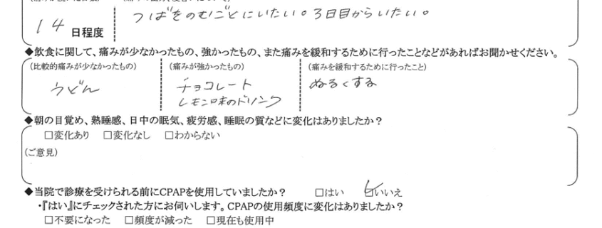 (痛みの程度について) つばを飲むごとに痛い。3日目から痛い。