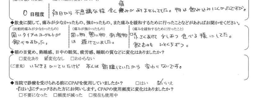 A:痛みに個人差があると聞いていましたが、本当に全く痛くなりませんでした。3日程で痛み止めの薬も服用をやめてしまいました。今では毎日静かに寝られています。今のところ飲酒してもいびきをかいてない様です。