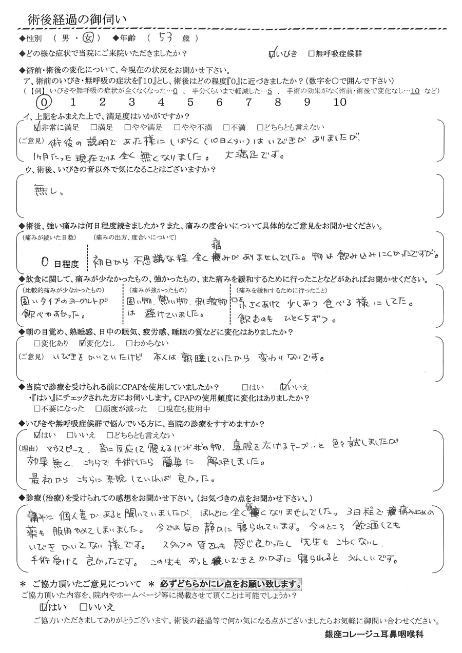 (ご意見) 術後の説明であった様に、しばらく(10日くらい)はいびきがありましたが、1ヶ月たった現在では全く無くなりました。大満足です。