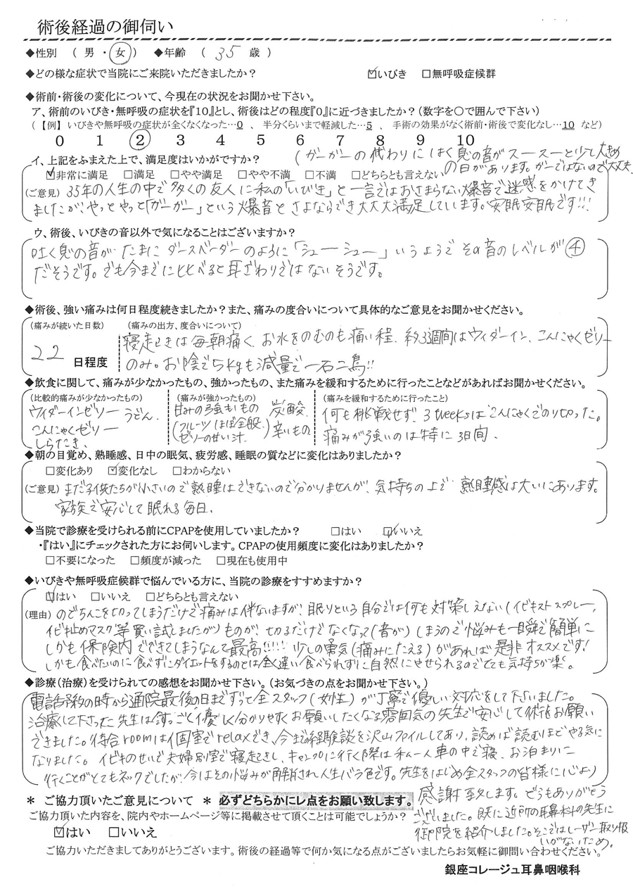 (ご意見) 35年の人生の中で多くの友人に、私の「いびき」と一言ではおさまらない爆音で迷惑をかけてきましたが、やっとやっと「ガーガー」という爆音とさよならでき、大大大満足しています。安眠安眠です‼!