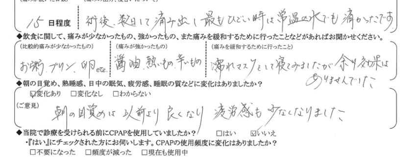 (痛みの程度について) 術後、数日に痛み出し最もひどい時は常温の水でも痛かったです。