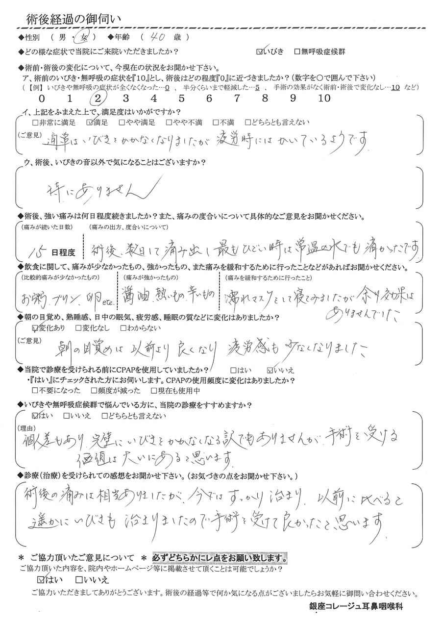 A:術後の痛みは相当ありましたが、今ではすっかり治まり、以前に比べると遥にいびきも治まりましたので、手術を受けて良かったと思います。