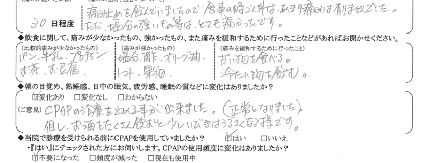 (ご意見) CPAPの治療を止める事が出来ました。(正常となりました。)