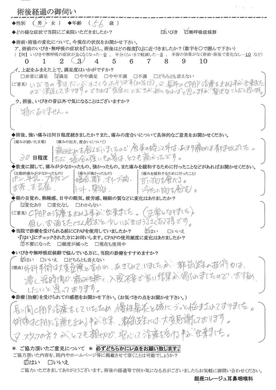 術後はCPAP治療を止める事が出来、都筑先生には大変感謝しております。