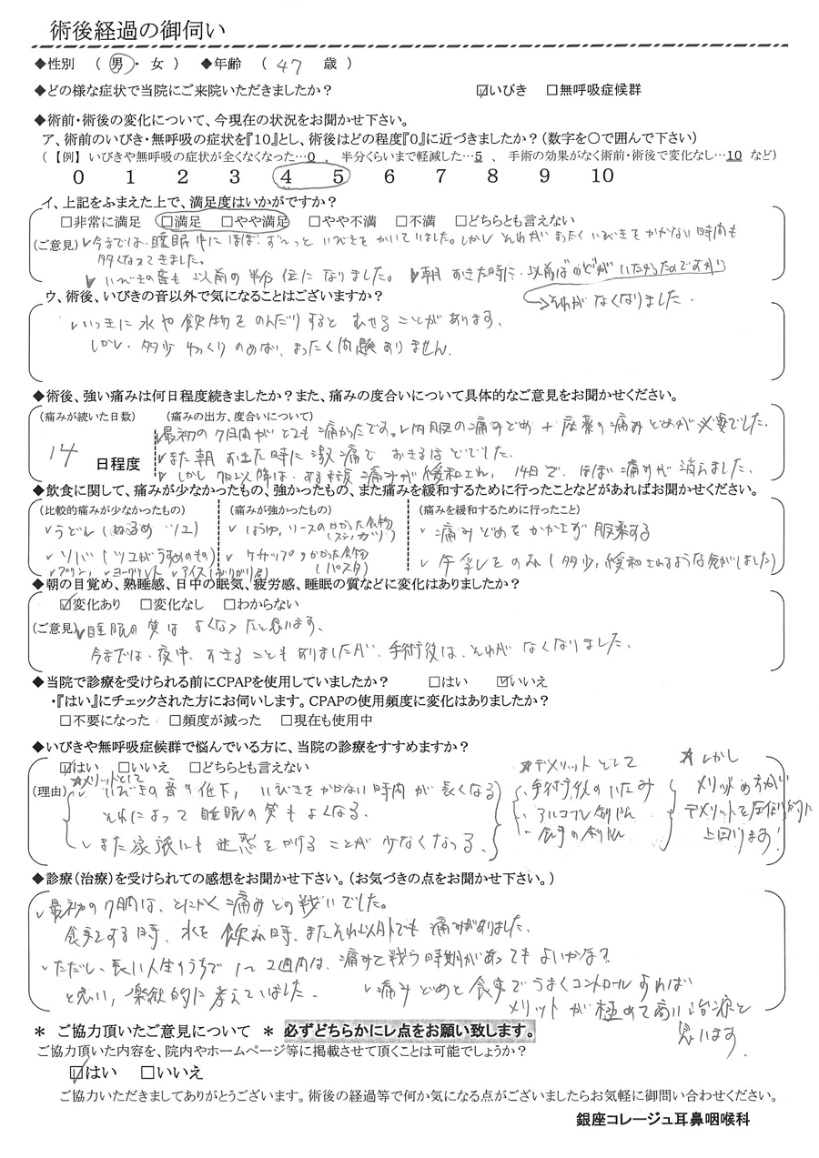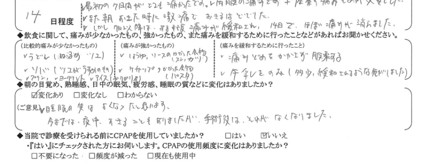 (ご意見) 睡眠の質は良くなったと思います。今までは夜中起きる事もありましたが、手術後はそれがなくなり