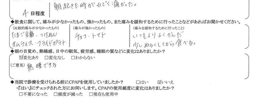 A:(痛みを緩和するために行ったこと) いつもより良く噛んだ。少しぬるくしてから食べる。