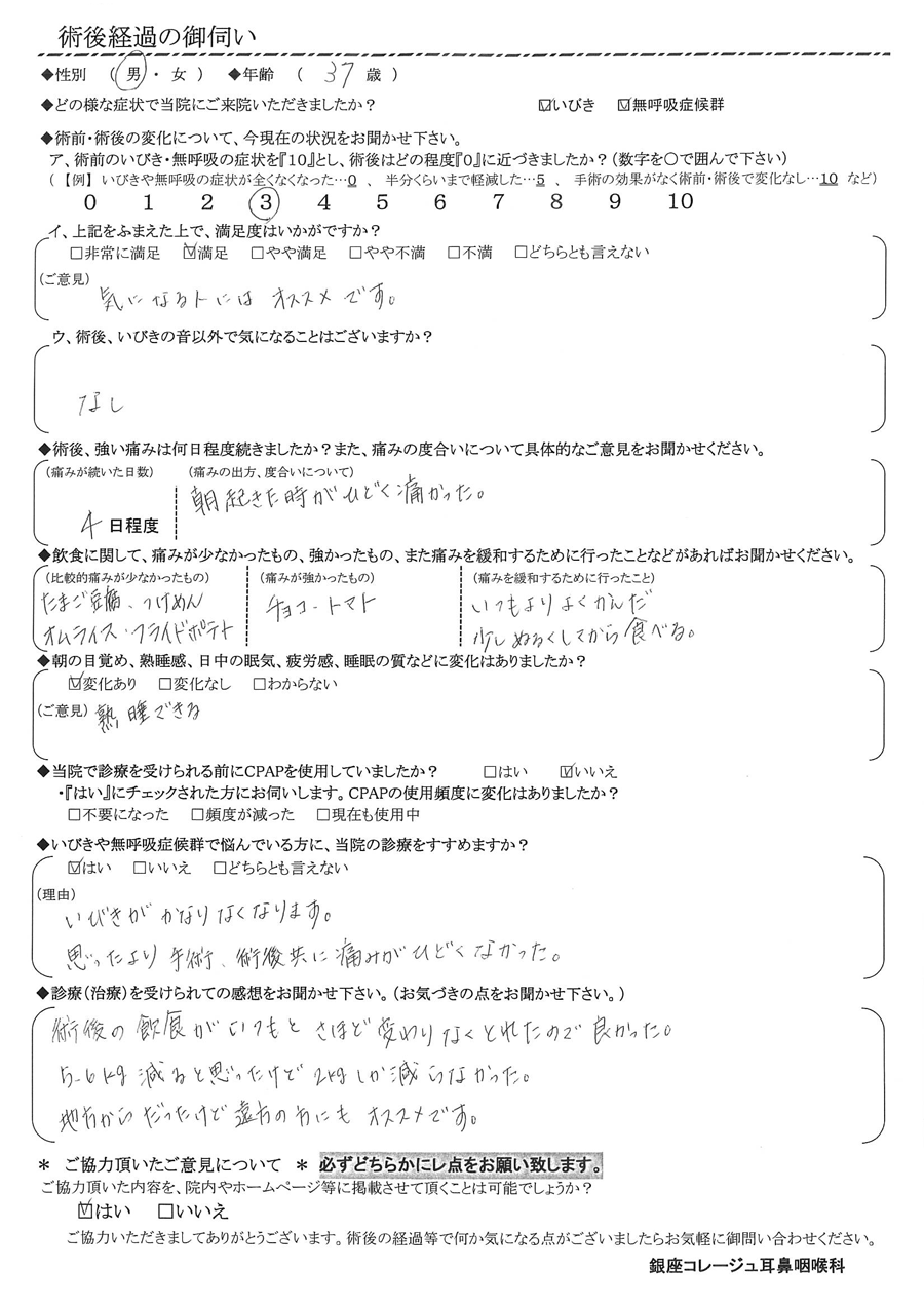 (理由) いびきがかなり無くなります。思ったより手術・術後ともに痛みがひどくなかった。