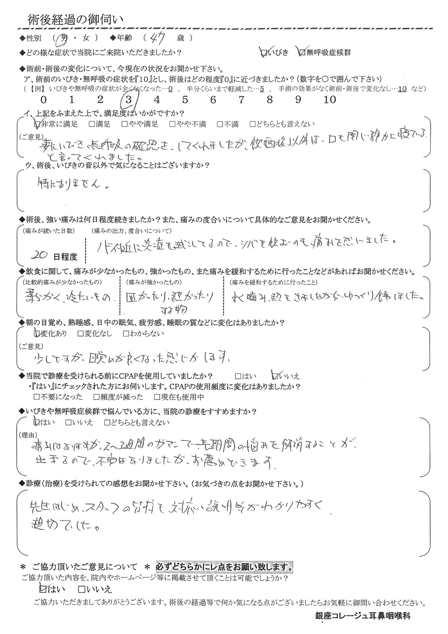 ア, 術前のいびき・無呼吸の症状を『10』だったとすると、術後はどの程度になりましたか? 【3】