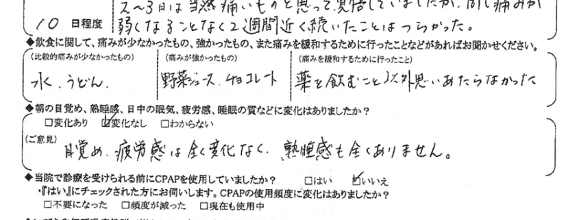 (痛みの程度について) 2~3日は当然痛いものと思って覚悟していましたが、同じ痛みが弱くなる事なく2週間近く続いた事は辛かった。