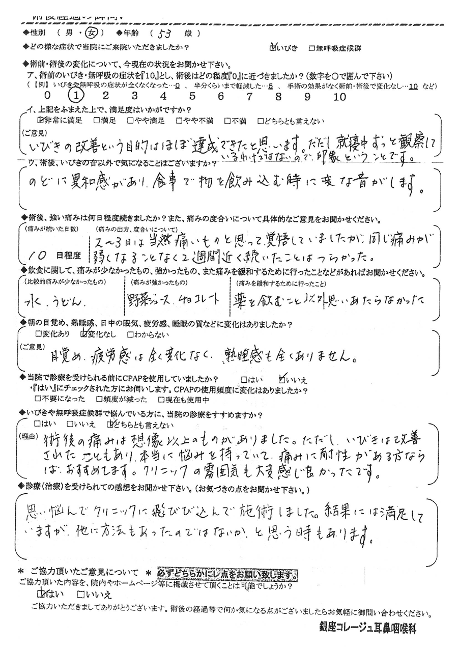 (理由) 術後の痛みは想像以上の物がありました。ただし、いびきは改善された事もあり本当に悩みを持っていて、痛みに耐性がある方ならばおすすめします。クリニックの雰囲気も大変感じ良かったです。
