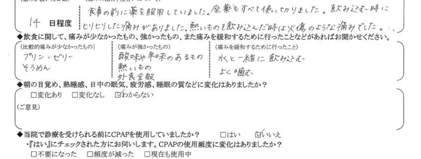 A:(痛みを緩和するために行ったこと)  水と一緒に飲み込む。よく噛む。