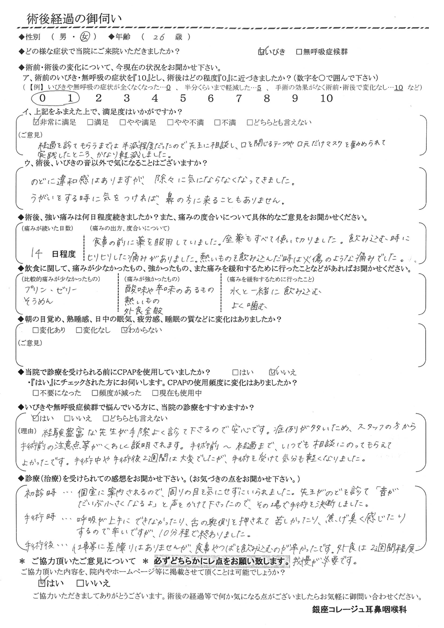 A:初診時…個室に案内されるので、周りの目を気にせずにいられました。先生が喉を見て「音がだいぶ小さくなるよ」と声をかけて下さったので、その場で手術を決断しました。