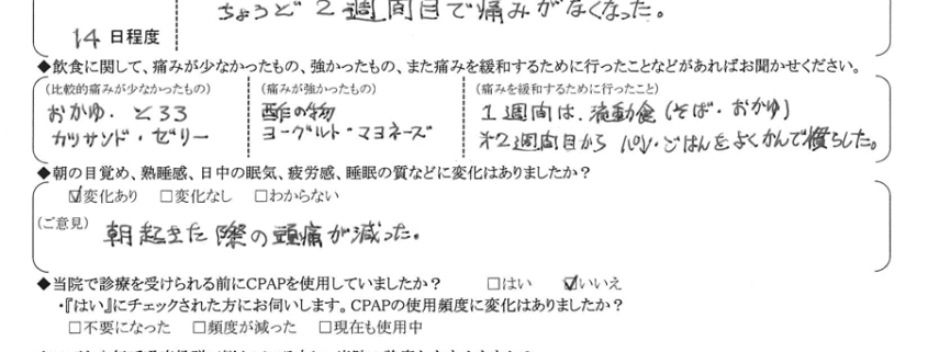 A:(痛みを緩和するために行ったこと) 1週間は流動食(そば・おかゆ)。第2週目からパン・ごはんを良く噛んで慣らした。