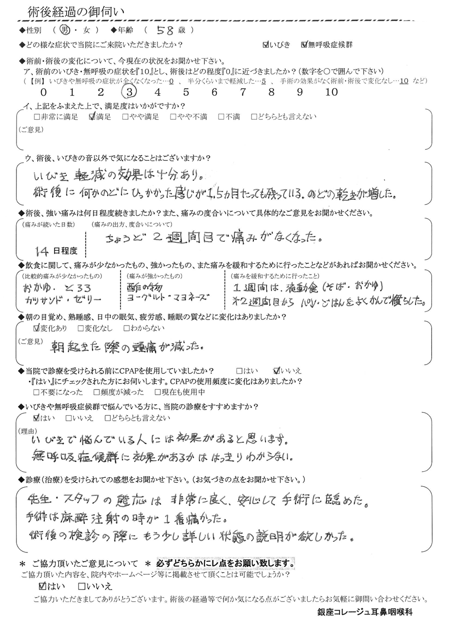 いびき軽減の効果は十分あり。術後に何かのどにひっかかった感じが1.5ヶ月経っても残っている。のどの渇きが増した。