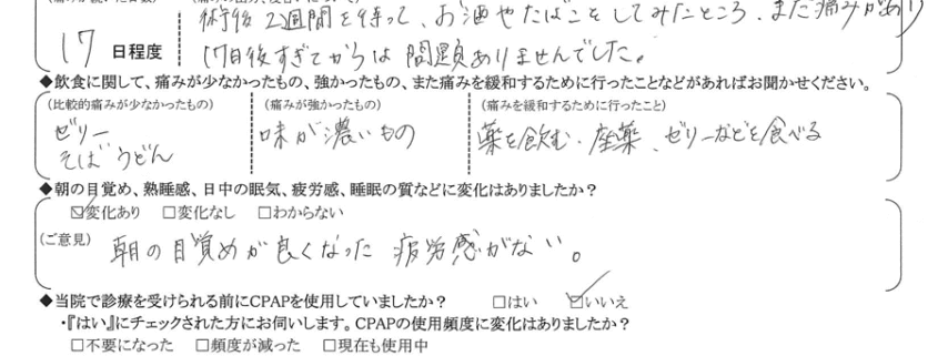 (痛みの程度について) 術後2週間を待って、お酒やたばこをしてみた所まだ痛みがあり、17日後過ぎてからは問題ありませんでした。