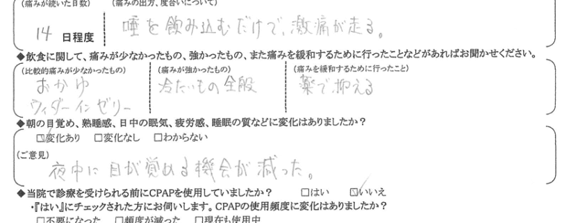 (痛みの程度について) 唾を飲み込むだけで激痛が走る。