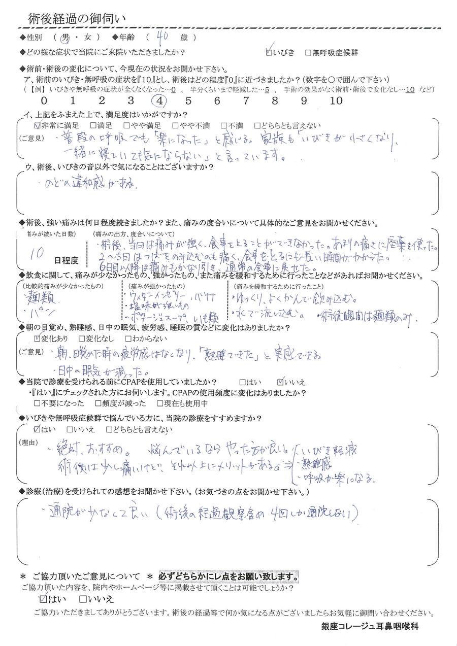 (ご意見) 普段の呼吸でも「楽になった」と感じる。家族も「いびきが少なくなり一緒に寝ても気にならない」と言っています。