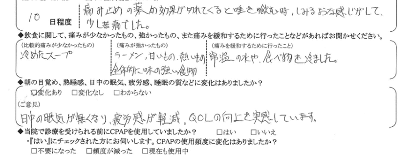 (ご意見) 日中の眠気がなくなり、疲労感が軽減。QOLの向上を実感しています。