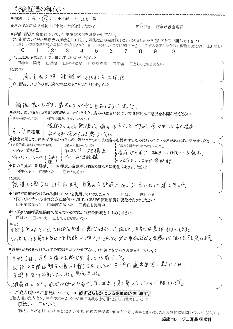 A:手術自体は本当に痛みを感じずあっという間でした。術後3日観は朝方の痛みと戦う日々でしたが、日に日に通常生活へ戻るにつれ、手術を受けて本当に良かったと思えました。術前はいびきの症状がひどかった為に、今の状況を見て驚く方ばかりで嬉しいです。