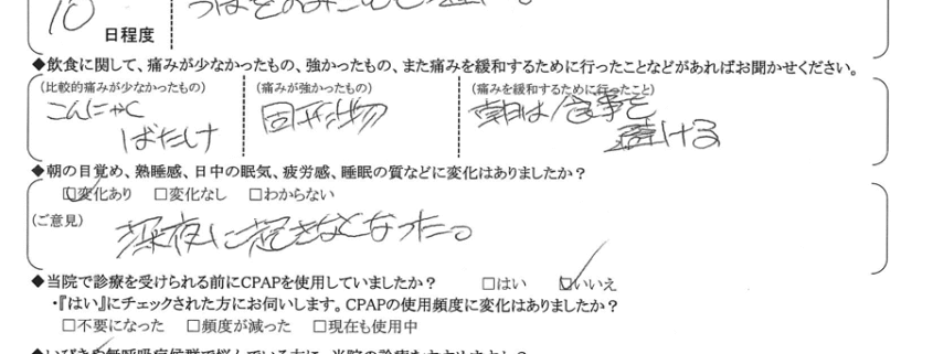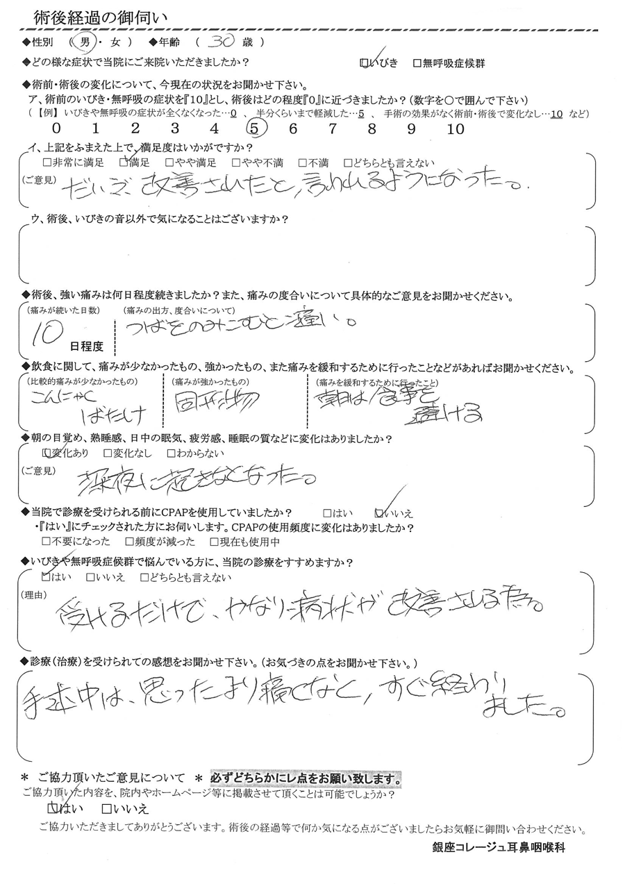 A:手術中は思ったより痛くなく、すぐ終わりました。たと思えました。術前はいびきの症状がひどかった為に、今の状況を見て驚く方ばかりで嬉しいです。