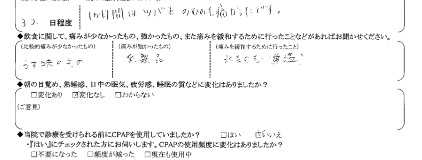 A:思ったより痛みが長引いたけれど、いびきも軽減し手術して良かったです。ありがとうございました。