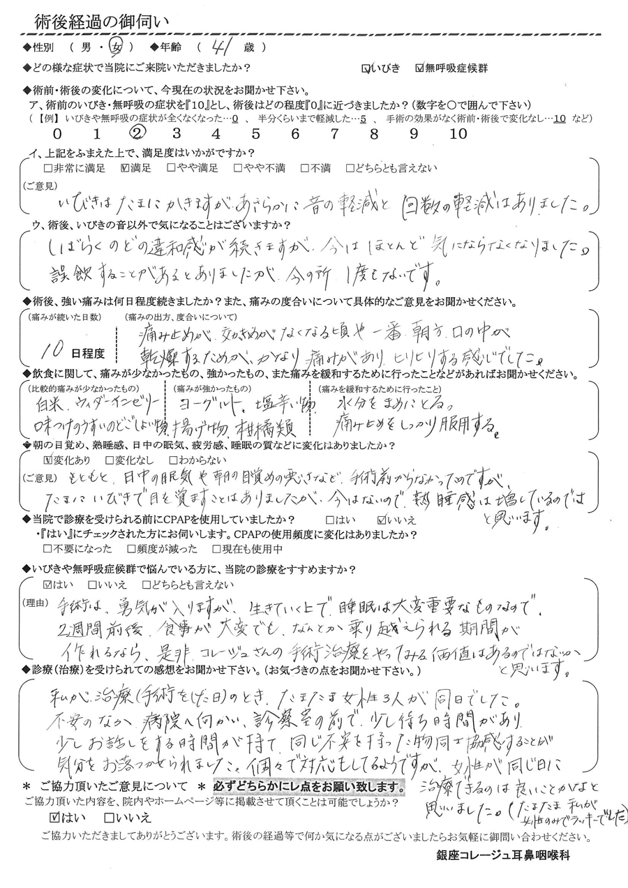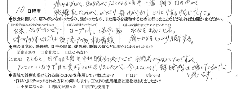 (ご意見) もともと日中の眠気や朝の目覚めの悪さなど手術前からなかったのですが、たまにいびきで目を覚ます事はありましたが、今はないので熟睡感は増しているのではと思います。