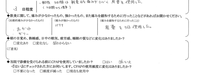 (痛みの程度について) 術後3日間は朝食時痛みがひどく、座薬を使用した。