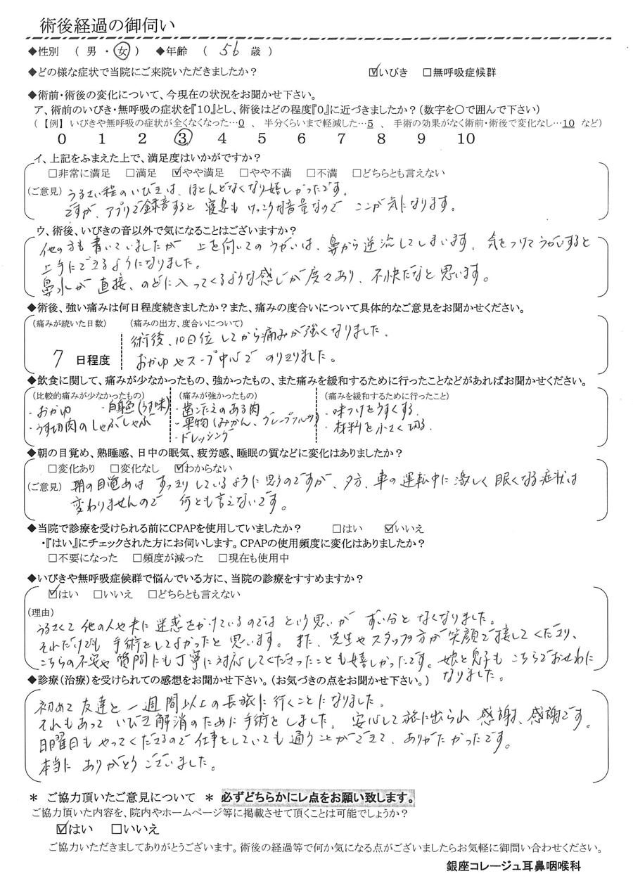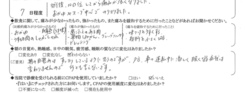 (ご意見)  うるさい程のいびきはほとんどなくなり嬉しかったです。