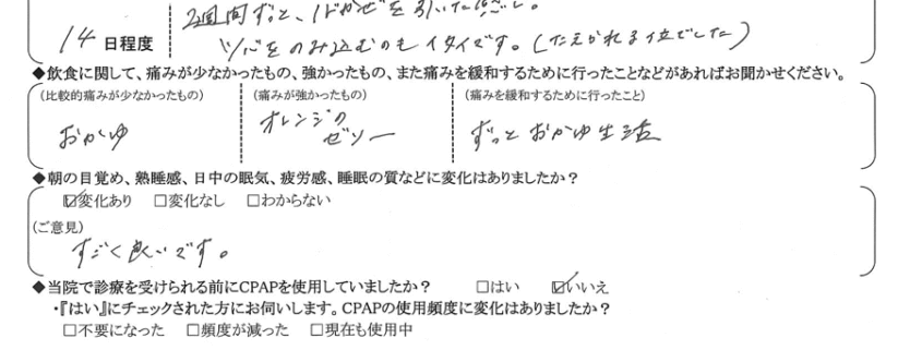 (ご意見)  お酒を飲んだ時など、まだいびきが出ますが、前よりは大分マシで満足しています。