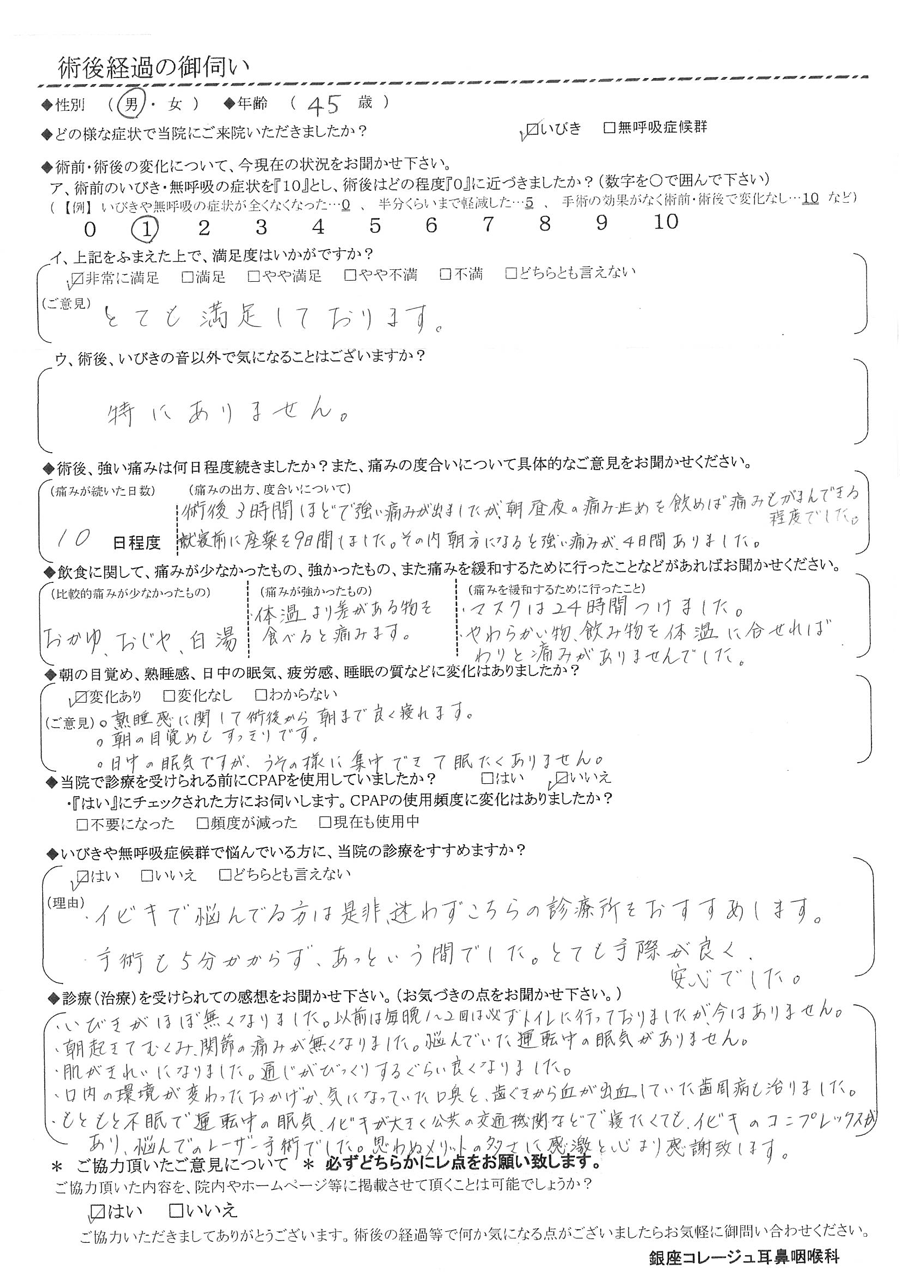 (ご意見) 熟睡感に関して術後から朝まで良く寝れます。朝の目覚めもすっきりです。日中の眠気ですが、嘘の様に集中出来て眠たくありません。