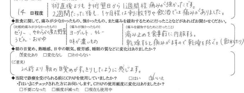 Q.術後、強い痛みは何日程度続きましたか?また、痛みの度合いについて具体的なご意見をお聞かせください。