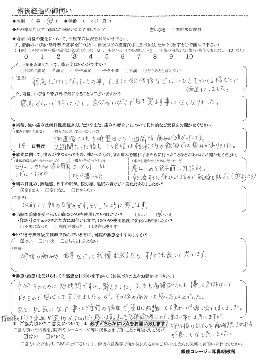 ア, 術前のいびき・無呼吸の症状を『10』だったとすると、術後はどの程度になりましたか? 【3】
